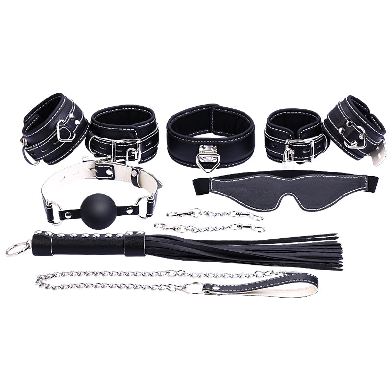 Contents: Blindfold, mouth gag, collar, leash, handcuffs, ankle cuffs, whip